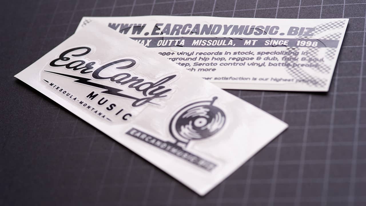 Quality 8 mil screen printed Clear adhesive or Clear static cling vinyl. Available as inside window or outside window application.